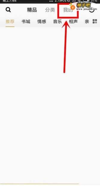 2进入到企鹅fm首界面中之后,在该页面的顶部栏目中我们找到我的这个选项,点击进入。