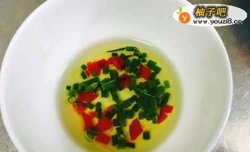 5接下来准备一个干净的碗,里面加入适量葱花和一勺剁椒,以及一大勺麻油和0.5克盐,加入一勺刚刚煮蘑菇的水,搅拌均匀。把葱白部分放到油里面煸香即可。