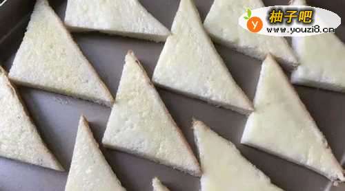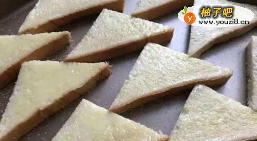 把吐司以对角线位置切开,一块吐司分成四小块。