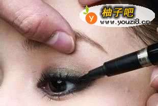 上眼线应该从眼尾开始画,显得更加自然平滑首先用眼线笔从眼尾处画。方法是用手指抬起上眼皮,这样可以更方便地用眼线笔“填”满睫毛根部的空隙。