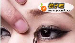 在眼尾处延长眼线,在视觉上拉长眼形。手指抬起眼尾处的眼皮,在眼线末端、近眼角位置把眼线升高,约1cm,并将翘起部分加粗,画成三角形。