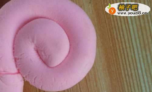 首先挑选一个自己喜欢的颜色的粘土,将挑选出来的粘土搓揉成一个圆柱形。然后将这个圆柱形粘土的一端向上卷,从这一端一直卷到另外一端,形成一个卷儿。