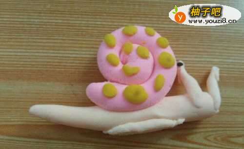4再取出一个颜色的粘土,将这个颜色的粘土搓揉出三个细细的条状。取出一个细条状的粘土固定在稍微粗一些的条状下面作为蜗牛的身体。
