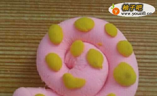 2再选择一个自己喜欢的颜色的粘土,将这个颜色的粘土先搓揉成细细的条状,然后再用手将细细的条状切成一小块儿一小块儿的。把这些小块儿状的粘土揉成小圆点固定在卷儿状粘土上。