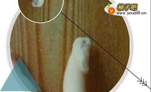 6取出两个带黑点儿的细条状的粘土,分别将这两个带黑点儿的细条状的粘土固定在一头粗一头细的条状粘土的粗的那一头儿。注意将黑点朝向外面。