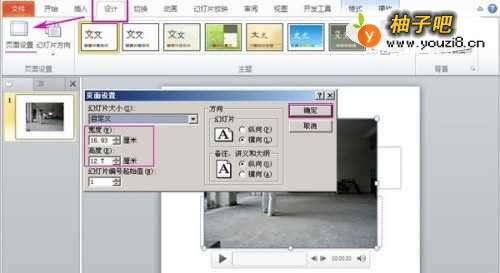 5我们看到原始尺寸,宽度和高度是多少?记下来,然后点击关闭。再进入 菜单“设计”- “页面设置”输入刚才我们看到的原始尺寸宽度和高度,然后确定。这一步主要是设置ppt的宽度和高度。