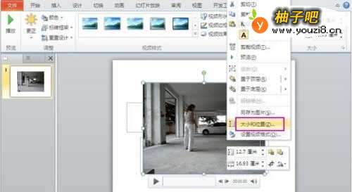 6设置ppt的宽度和高度,设置的其实就是视频的宽度和高度,这时候我们需要把视频调成原始尺寸然后与ppt刚好对应。我们再在视频画面上点击鼠标右键,点击大小和位置