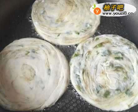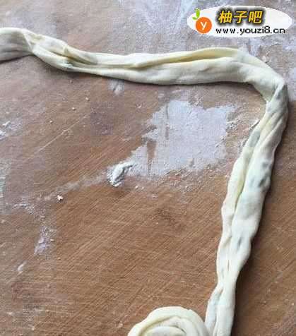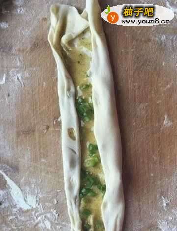 44、捏成长方形的面形状,尽量要薄一些,涂上油酥撒上葱花即可。