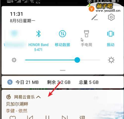 7打开后,网易云音乐的通知就会在状态栏中显示。