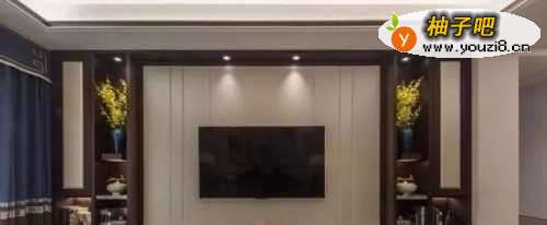 3客厅地面的仿石纹地砖,呼应电视背景墙天然石材的纹路,对称设计的博古架搭配米色的电视背景,整体淡雅柔和,不至于显得太过深沉。