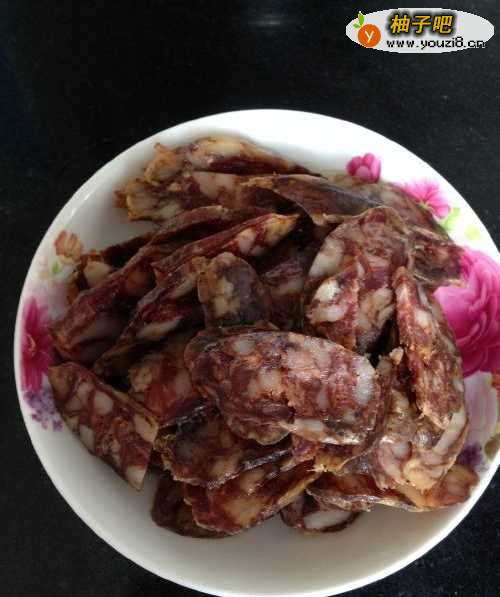 因为香肠是自己家里事先晾晒好的,所以蒸香肠这倒菜很简单。只需把香肠洗好切好并装盘。
