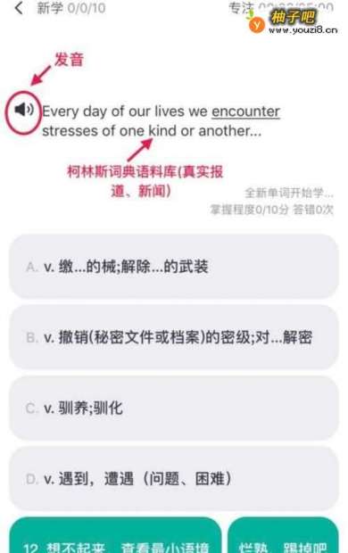 背单词,一定要把单词代入语境中去学习。用语境背单词其实已经是老生常谈了。在以往,我们往往用看剧或者看外刊的方式去学习,但其实有些材料并不一定对自己有帮助,而且找起来也费时间。我在拓词发现了语境训练的模式,里面的语境例句全是出自柯林斯高阶词典的权威语料库,而且都是真实的新闻、报道中的句子,很适合学习。