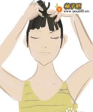 77.梳顶:可以使百脉调和,改善头部末梢血液循环和大脑供血,活跃大脑生理功能。方法:十指如耙,如梳头状从前发际梳到后发根,从前额的“上星穴”到头顶的“百会穴”,从后脑“风府穴”到“大椎穴”。然后左右梳顶,前后左右各9次。