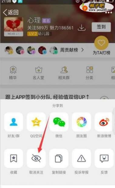 6第六,底部出现分享到,在第二排按钮的第二个“取消关注”,点击。上方显示淡淡的“取消关注成功”