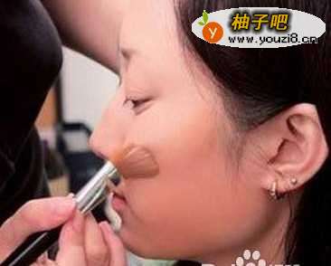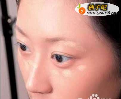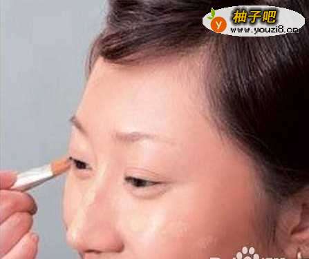 1略宽且太过方正的脸部轮廓,用比肤色深一点的粉底来弥补,阴影感可以“欺骗”观众的视线,让脸庞变小一圈。用同色的粉底来修饰眼窝处,可以加强眼睛的深邃感。