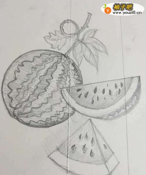 4第四步 在西瓜旁用橡皮擦掉一个三角形 用来画那半西瓜 这样看起来紧凑一些