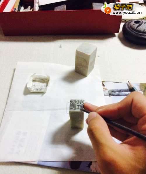 2首先在宣纸上描下印章的形状,然后在宣纸上用毛笔画下想要刻的形状的镜面图像