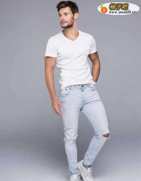搭配一:浅蓝色破洞牛仔裤牛仔破洞裤是一款非常潮流的裤子,而且浅色牛仔裤很适合夏天,搭配一件白色T恤非常帅气。