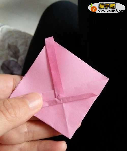 7把中间的两个角向内折,然后把上边的边向下折,另一面如此照做。