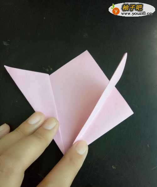 正方形纸,对折成三角形。把三角形的两个角往上折,变成图四。