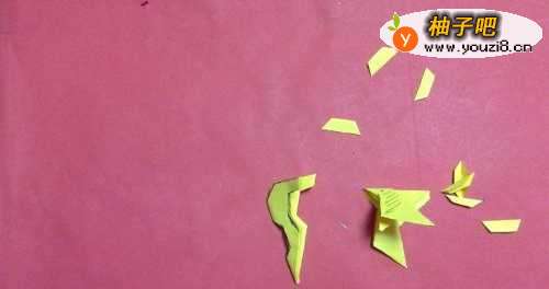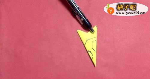 2沿长边以中间点为轴,向上折一角。另一角向后反折。