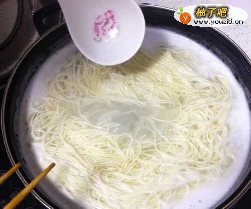 2水开锅后把面条放到锅中,用筷子搅拌。