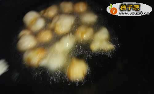 5然后,待炸制面糊前,将面糊再搅拌一下,再用筷子挑起小团面糊放入锅中,尽量每次将面糊团挑的大小均匀一点。这样炸制出的面糊比较内软外焦脆。
