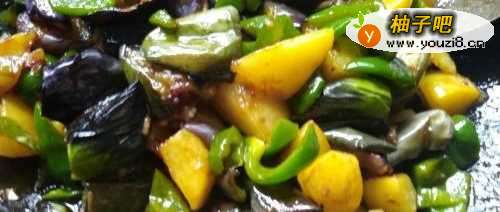 12放入炸好土豆块、茄子块、最后放青椒块翻炒均匀,出锅加鸡精调味装盘。