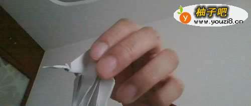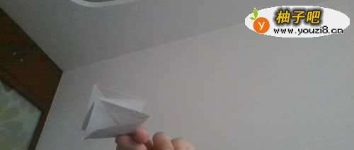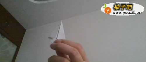 2我们现在将折纸展开,就可以看到刚才的折痕。我们沿着折痕,朝内翻折。