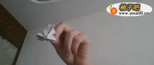 4现在我们把折纸进行朝下进行翻折。现在下面的4个开口处,我们用剪刀将他们剪开。作为章鱼的8条腿。