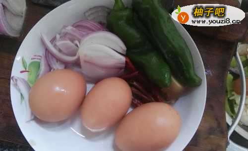 将鸡蛋打出来,用打蛋器或筷子垂直搅拌100-120圈,将洋葱、青椒等切成条片状。