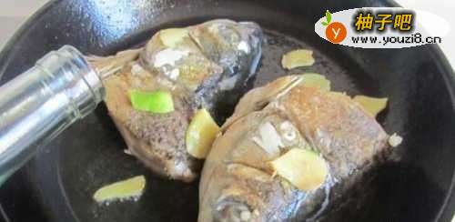 2热锅凉油放入鱼头煎至金黄后,将鱼头翻个面再煎一下,随后放入料酒和姜片;