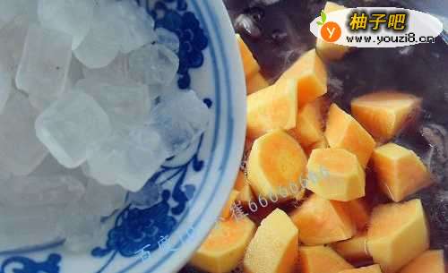 6大火转小火,大约炖一个小时,加入准备好的红薯和冰糖一起炖。