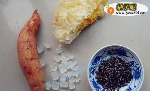 这道营养美食常吃好处多多,先准备好用到的主要食材,银耳,冰糖,红薯,紫米。