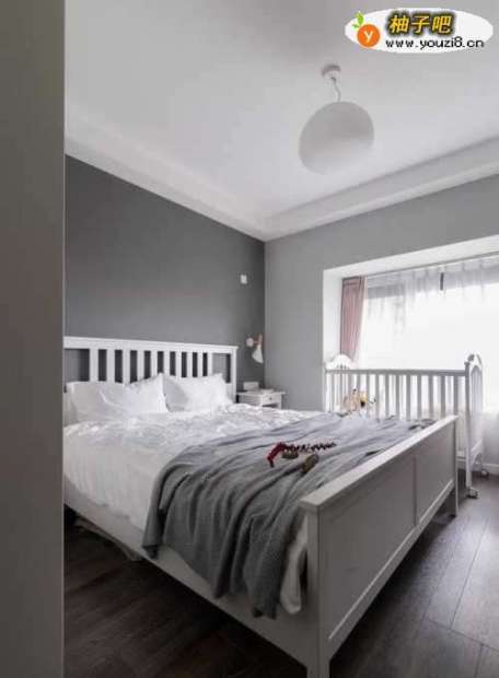 6主卧的的地方不大,光一张大床就占了不少地方。床边还有一个婴儿床,方便照顾刚出生的婴儿。灰色的墙壁,搭配白色床品和衣柜,很是干净整洁。
