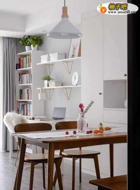 由于业主对于电视机的需求很少,于是将其省下一片空间,做些其他的设计。这个客厅中原本的电视景墙处,就装修成了一个小书房,角落处的书架,中间的书桌,还有上边的两层置物架,设计的十分巧妙,实用性很强。