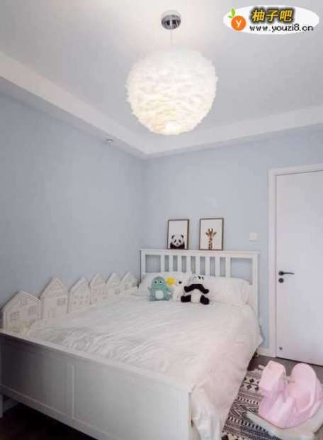 7儿童房装修的比较有童趣,天蓝色的墙壁,白色的羽毛灯,可爱的娃娃,很适合孩子生活。