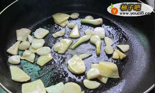 4热油锅放蒜片,姜,葱白炒香