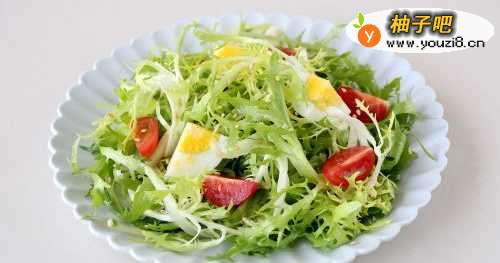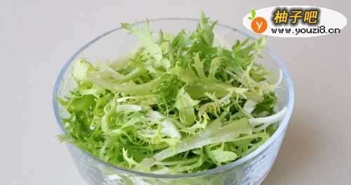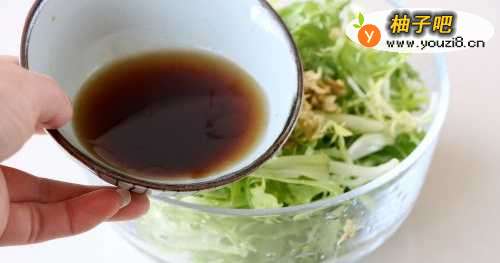 4锅内放适量的 色拉油,放入大蒜末炒香,浇在苦菊上面;