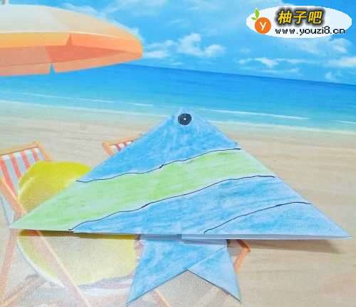 6第六步:用黑色的笔画出鱼的眼睛,鱼画上线条和涂上自己喜欢的颜色,如下图所示。