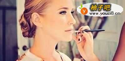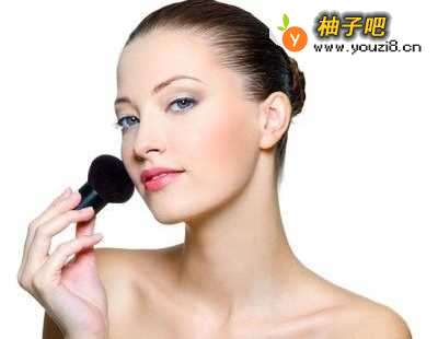 5用海面约一半的面积沾上粉饼,从脸颊,由内往外、由上往下地轻轻地按压。