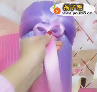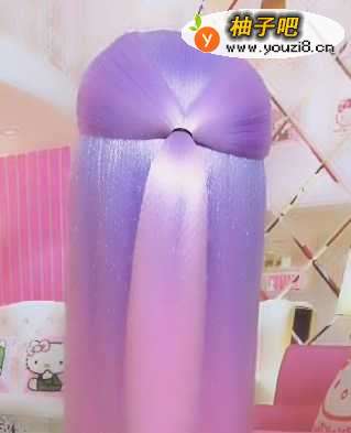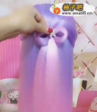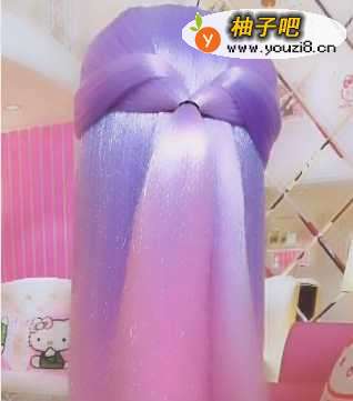6穿两次后就会形成一个比较固定的小椭圆形,然后把这个小的椭圆形网上推,推到那会一开始固定的两缕头发梳住的皮筋那里,弄成蝴蝶结的形状