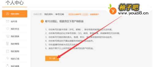 4在注销界面中,会提示帐号注销后,将放弃以下资产和权益。我们确认放弃后,点击【下一步】。
