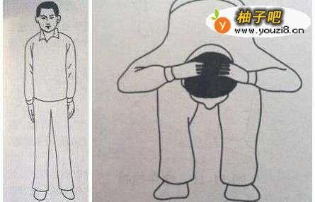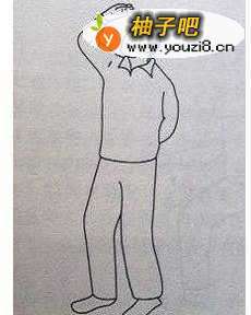 第二,左脚向左跨出一步,两腿分立同肩宽,两手用力抱头后部,手指贴枕后,以两肘用力张开,手指敲小脑后部片刻,然后配合呼吸做屈体动作。吸气时,身体挺起,呼气时,俯身弯腰,头垂至膝间作躬身状,两膝维持挺直,如此反复进行9~20次。第三,缓缓伸腰站起,两手自然下垂。注意弯腰垂头的幅度应因人而异,不可勉强。对患有高血压和脑动脉硬化者不宜。