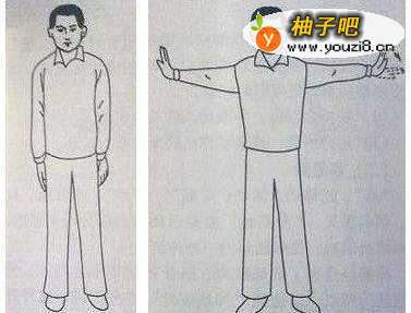 第一,两臂从左右方缓缓下落至两臂侧平举,掌心向下,两腿开立,与肩同宽。