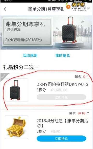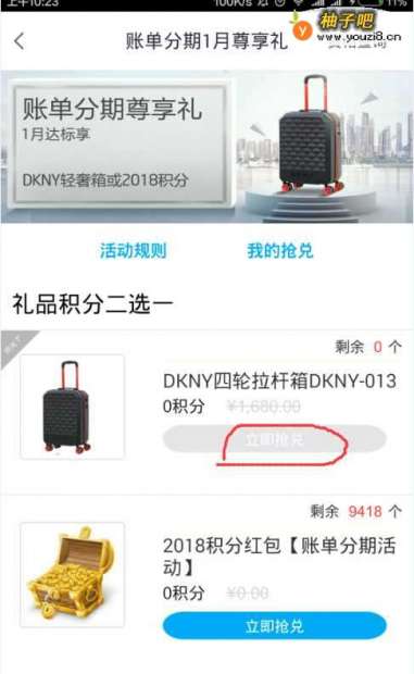 3进入抢兑页面后,可以看到当前分期活动的抢兑奖励有两种,分别是DKNY拉杆箱和两千多的永久积分,相对两说拉杆箱比积分划算,但拉杆箱比较难抢