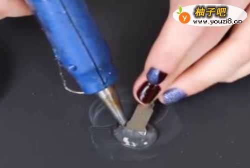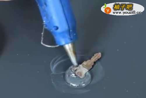 3然后将只剩下一半的钥匙,放入涂抹有滑石粉的区域,用预热好的热熔胶从钥匙顶部画一个圆形出来,然后等待热熔胶凉透。