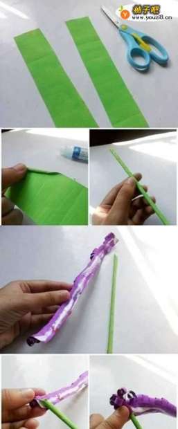 3然后再拿出一张绿色的长方形衍纸,作为花梗,从长方形的一角开始卷起,直至卷完(注意:要卷的紧一点),把刚刚做好的花儿涂上胶水,然后一圈一圈的粘在花梗上