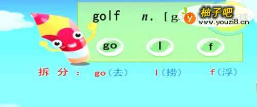 趣味记忆:小猴子去(go)捞(l)浮(f)在水面上的高尔夫球(golf)。