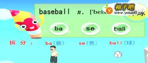 趣味记忆:爸爸(ba)有一个白色(se)的球(ball)是棒球(baseball)。